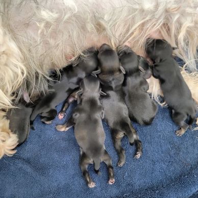 Weekly updates are emailed from the time they are born up until 6 weeks of age or until puppy selection time happens. Also at 6 weeks of age is when they receive their 1st series of core vaccinations and start potty training outside. Puppy selection time can be scheduled in person or virtual. Because of sanitary reasons, visits will mostly be outside with sanitation precautions before meeting and handling pups.